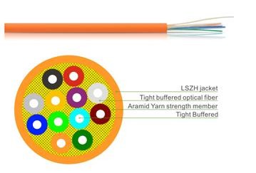 Most indoor fiber optic cables are tight buffer design, usually they consist of the following components inside the cable, the FRP which is non-metallic strengthen member, the tight buffer optical fiber, the Kevlar which is used to further strength the cable structure, making it resist high tension, and the cable outer jacket. The trend is to use LSZH or other RoHS compliant PVC materials to make the cable jacket; this will help protect the environment and the health of the end users. Usually the single mode indoor fiber optic cables are installed between the buildings where the distance is more than 100 meters, while multimode indoor fiber optic cables are used shorter distance connections. We supply SMF and MMF indoor fiber cables with various structures for different applications.